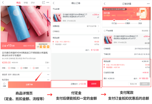 顧客購買流程十分清晰,分為三個階段:支付定金——支付尾款——收貨。由于預售活動的優(yōu)惠力度已經(jīng)很大了,所以預售商品就不再支持其他任何營銷活動,如紅包滿免等。