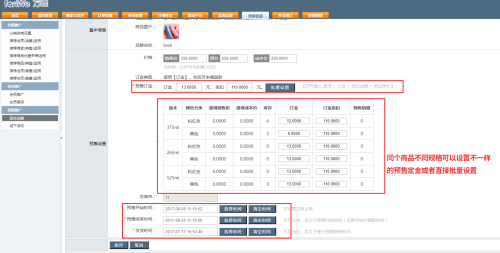 選擇了預售商品后,系統(tǒng)會將預售商品下的所有貨品列出,這時候就可以單獨設(shè)置貨品的預售訂金、預售開始時間、預售結(jié)束時間、發(fā)貨時間等。