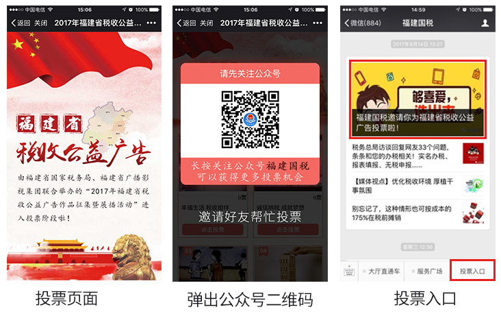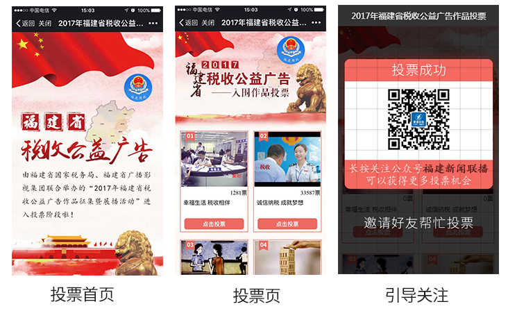 用戶在進(jìn)入投票活動頁面后,翻頁時會彈出“福建國稅”公眾號二維碼,掃描關(guān)注了該公眾號后,再進(jìn)行投票。