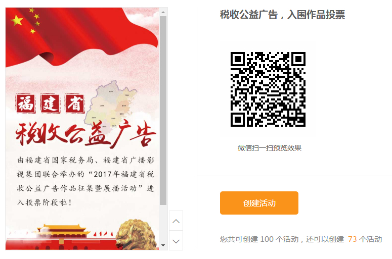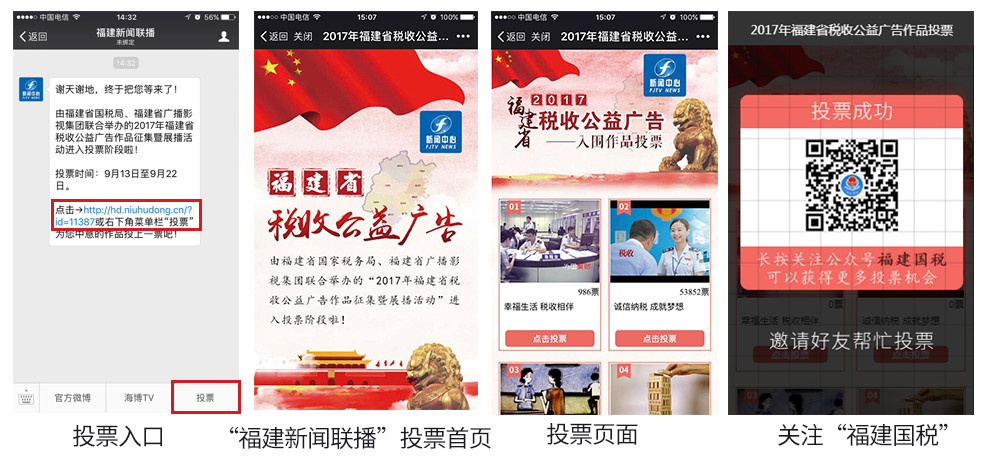 方維?;又Ω=ㄊ叶悇?wù)局與福建省廣播影視集團(tuán),通過微信投票的形式,開展稅收公益廣告的評選活動,進(jìn)一步擴(kuò)大活動影響力。