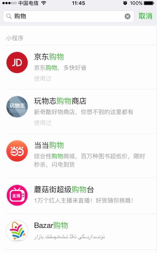 除了使用過這一因素外,當(dāng)我們搜索某個關(guān)鍵詞時,小程序的排列順序似乎讓我們看不懂。其實,微信為了大力推廣小程序,對于越早入駐的商家越在排名上給予支持,也就是注冊越早越靠前(不同的手機略有不同,絕大部分搜索到的小程序以及排名是一致的)。