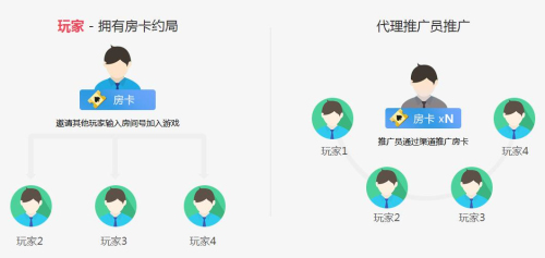 房卡模式是一種什么模式呢?我們也常稱為熟人模式,即熟人之間通過微信、朋友圈的分享鏈接聯(lián)系約局進行游戲。同時,推廣代理把游戲推薦給玩家并引導(dǎo)他們參與游戲,只要被邀請的玩家在游戲的過程中購買房卡并進行充值,運營商就會依照一定的比例返利給線上推廣代理。