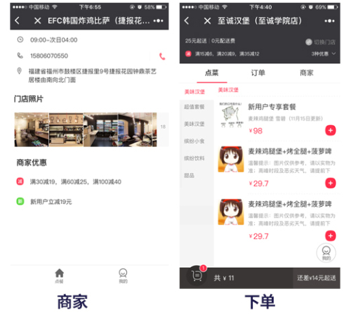 用戶可通過附近的小程序進入外賣小程序門店,進行點餐、結算,支持使用積分、余額,還可查看訂單和商家信息。