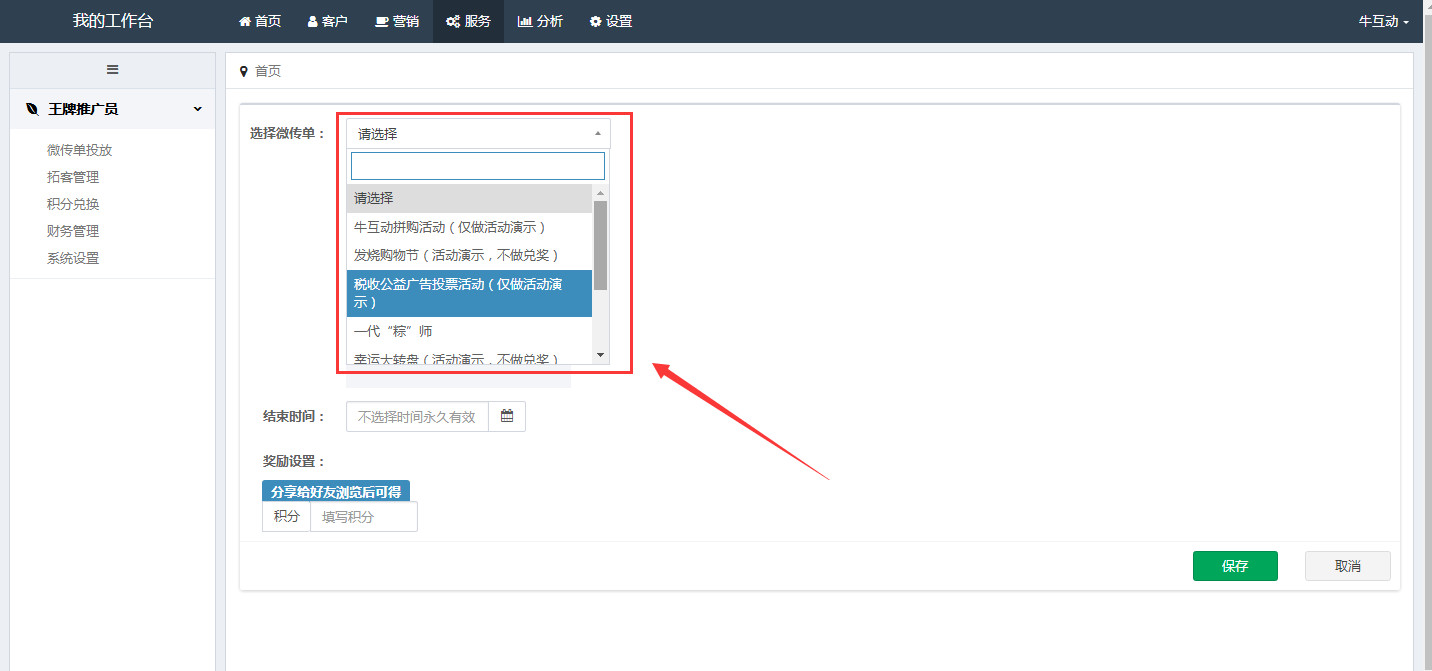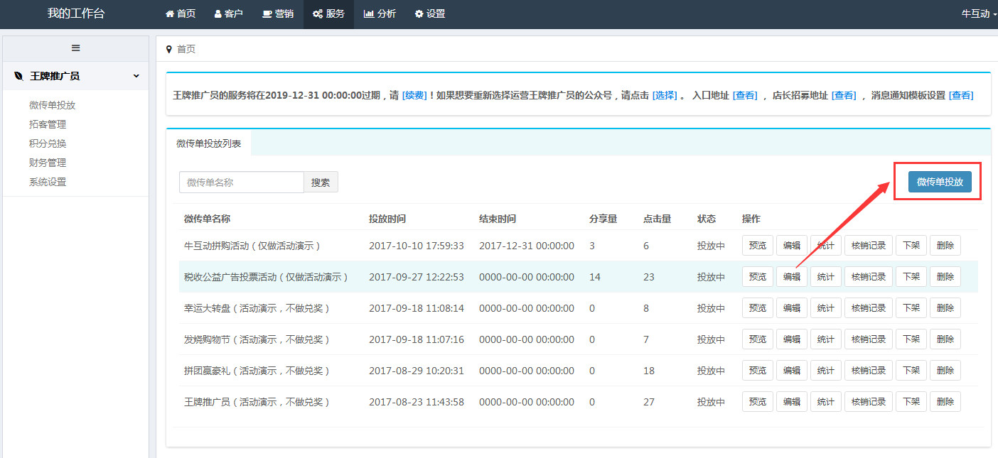 操作流程:【服務(wù)】→【王牌推廣員】→【微傳單投放】
