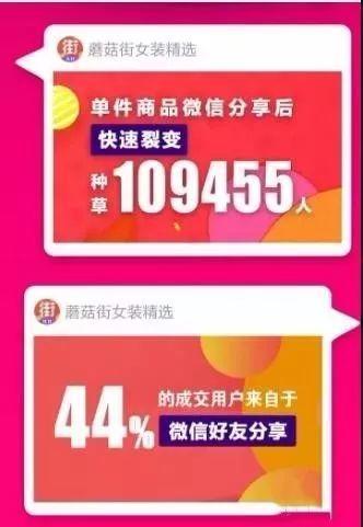先來(lái)看蘑菇街的數(shù)據(jù)。今年雙 11 ,蘑菇街單件商品經(jīng)微信分享后快速裂變,最高「種草」(打開(kāi)了分享鏈接) 109455 人;小程序中有44% 的成交用戶(hù),來(lái)自于微信好友分享;小程序內(nèi)新客成交占比達(dá)到蘑菇街 App 的 4.2 倍;小程序內(nèi)用戶(hù)剁手成功率比 App 高 16.1 個(gè)百分點(diǎn);小程序用戶(hù)剁手手速達(dá)到 App 的 2.28 倍。