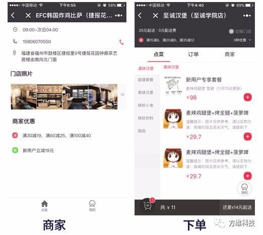 用戶(hù)可通過(guò)附近的小程序進(jìn)入外賣(mài)小程序門(mén)店,進(jìn)行點(diǎn)餐、結(jié)算,支持使用積分、余額,還可查看訂單和商家信息。