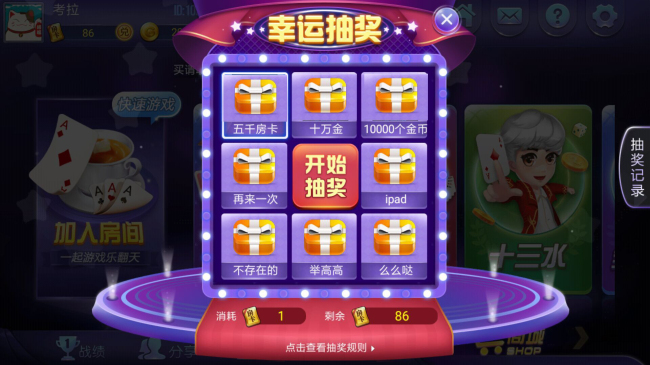 想要留存用戶,抽獎可以說是最簡單粗暴卻效果奇佳的活動玩法了!方維棋牌就為客戶開發(fā)出了有趣的抽獎環(huán)節(jié)。每次抽獎僅需消耗一張房卡,便能隨機(jī)抽中誘人的獎品。這樣的抽獎環(huán)節(jié),既能提升用戶的活躍度,也能讓用戶獲取金幣等獎品后,更積極地投入游戲!