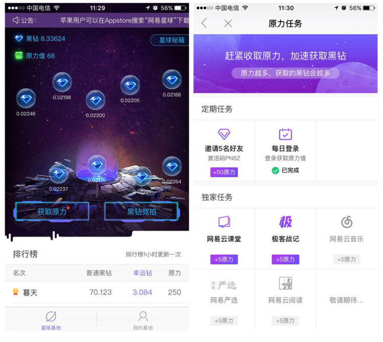 根據(jù)“網(wǎng)易星球”規(guī)則,“黑鉆”基于“原力”(“原力”即算力)產(chǎn)生,用戶可以通過完成登錄、邀請好友等任務(wù)獲得原力,原力越高,獲得的“黑鉆”越多。