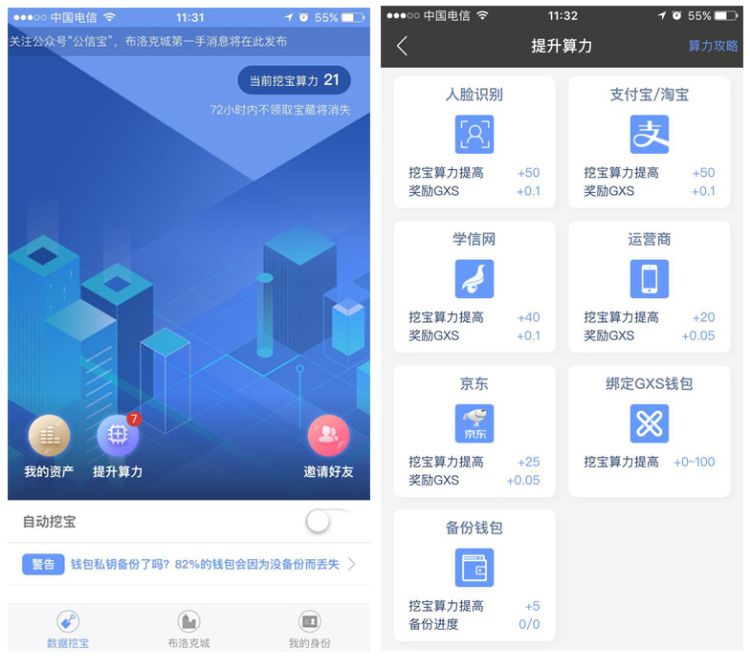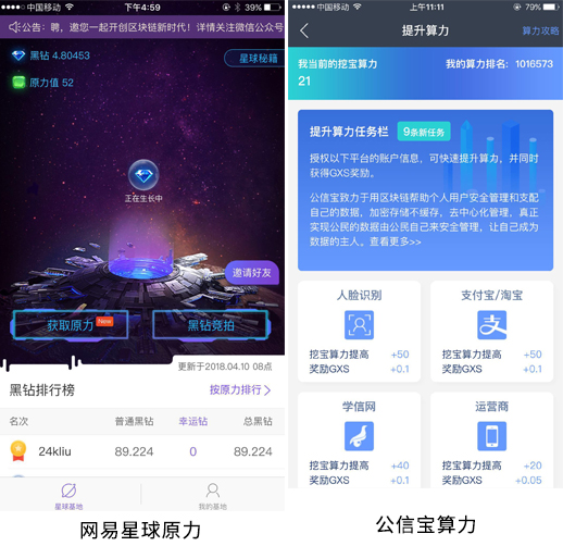 而公信寶提出了用數(shù)據(jù)挖礦的服務(wù),門檻很低,用戶提供越多的個人數(shù)據(jù),如綁定人臉識別、支付寶/淘寶、學(xué)信網(wǎng)等,算力就越高,挖出的礦也就越多。