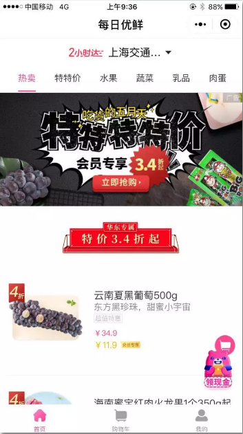 從體驗角度來講,每日優(yōu)鮮小程序延續(xù)了其APP一貫的風(fēng)格,頁面清爽干凈,購買過程簡單流暢。為配合小程序上線,每日優(yōu)鮮還特別為新用戶推出了總額1000萬元的現(xiàn)金紅包、5000張老用戶8.5折優(yōu)惠卡,以及小程序?qū)偬貎r商品。
