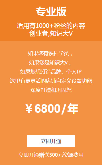 相對于其他兩個版本,專業(yè)版店鋪豐富的功能設定,適用于擁有一定粉絲基礎的內容創(chuàng)業(yè)者,打造自有品牌,建立強大的知識IP,知識大V通過專業(yè)版店鋪能夠更好地實現(xiàn)內容變現(xiàn)。