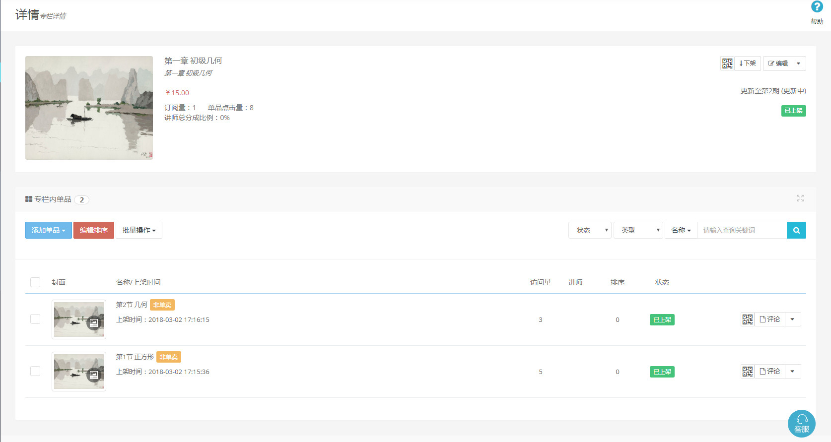 學拾支持將課程歸類到同一專欄內,便于用戶進行系統(tǒng)性的學習。對于學員來說,一個完整、全面的課程專欄能夠為自己省去搜索查找課程的步驟,極大的提高了學習效率;而對于知識服務商來說,專欄有助于更好的進行課程管理,將同類別的課程集中推廣,加大課程深廣度,以優(yōu)惠折扣打包銷售課程,提升店鋪銷售額。