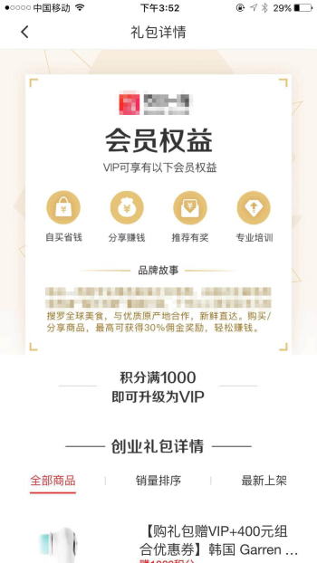平臺可設置購買創(chuàng)業(yè)禮包的門檻招募分銷人員,創(chuàng)業(yè)禮包價格可視情況自定。比如每日一淘的創(chuàng)業(yè)禮包為399元。
