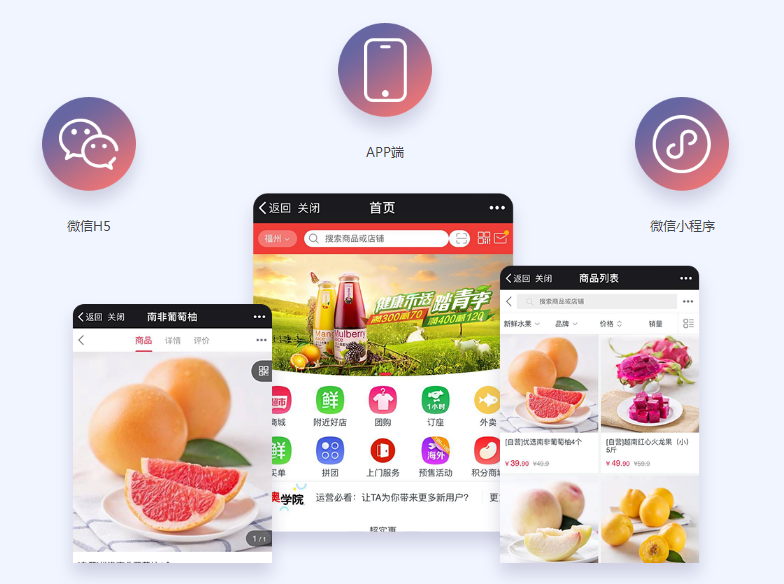方維社交電商平臺(tái)提供微信H5、APP端、微信小程序三大端口展示,支持對(duì)接各主流社交平臺(tái),讓商品傳播更廣,實(shí)現(xiàn)社交電商解決方案全覆蓋。