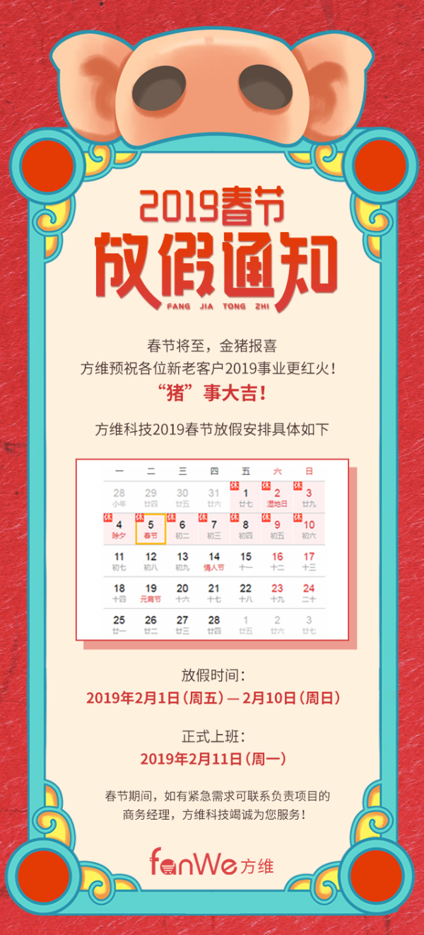 根據(jù)《國務(wù)院辦公廳關(guān)于2019年部分節(jié)假日安排的通知》,結(jié)合公司實際情況,方維科技2019年春節(jié)放假安排如下: