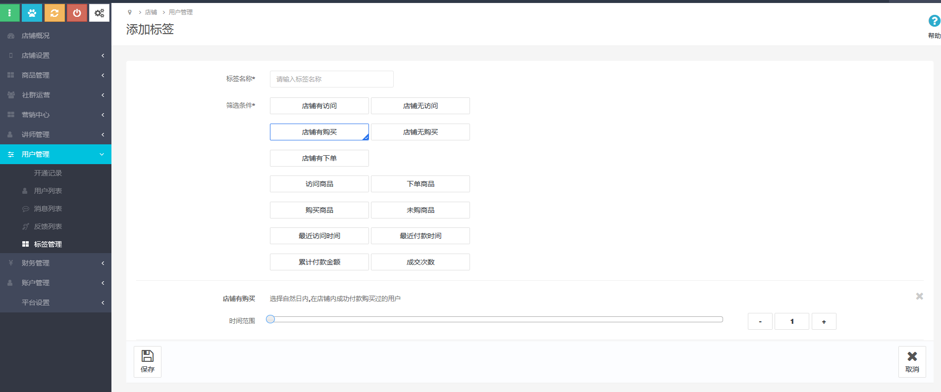 在【用戶管理--標簽管理】中創(chuàng)建不同條件的標簽,用戶在達成對應條件后,系統(tǒng)自動為用戶打上標簽。