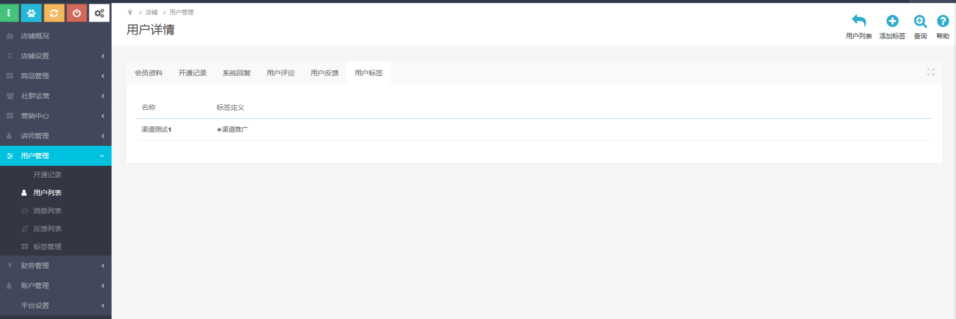 在【用戶管理--用戶列表】中選擇某個用戶,點擊【詳情】按鈕,選擇用戶標簽,可以為用戶手動添加標簽。