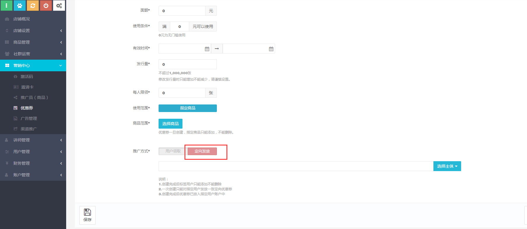 創(chuàng)建優(yōu)惠券時,可以選擇將這一批次的優(yōu)惠券定向發(fā)放給特定標簽的用戶,優(yōu)惠券創(chuàng)建完成后,優(yōu)惠券直接進入用戶的賬號中。
