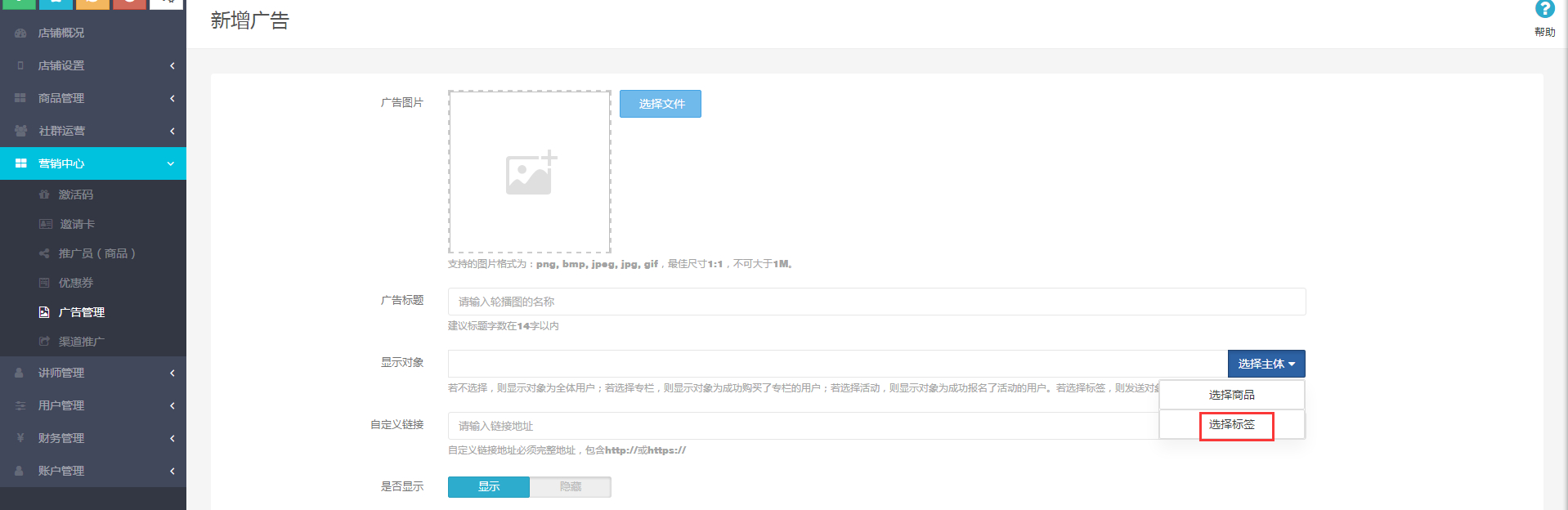 在后臺營銷中心中。可以向特定標簽的用戶推送首頁彈窗廣告。