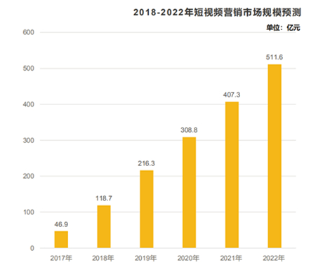 隨著各大頭部短視頻平臺(tái)不斷加速短視頻的商業(yè)變現(xiàn)腳步,短視頻營(yíng)銷(xiāo)市場(chǎng)規(guī)模保持著高速增長(zhǎng),預(yù)測(cè)到2022年,短視頻營(yíng)銷(xiāo)市場(chǎng)規(guī)模將突破500億元大關(guān)。