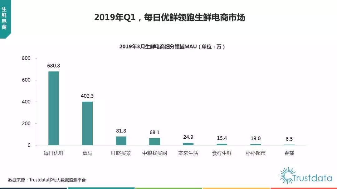 作為電商領(lǐng)域中新物種,前置倉(cāng)電商模式的先驅(qū)者,每日優(yōu)鮮在全國(guó)布置的前置倉(cāng)網(wǎng)點(diǎn)已經(jīng)超過1500個(gè)。截至2019年第一季度,每日優(yōu)鮮以680.8萬的月活量領(lǐng)跑生鮮電商行業(yè),并吸引到了49.2%的行業(yè)新增用戶。