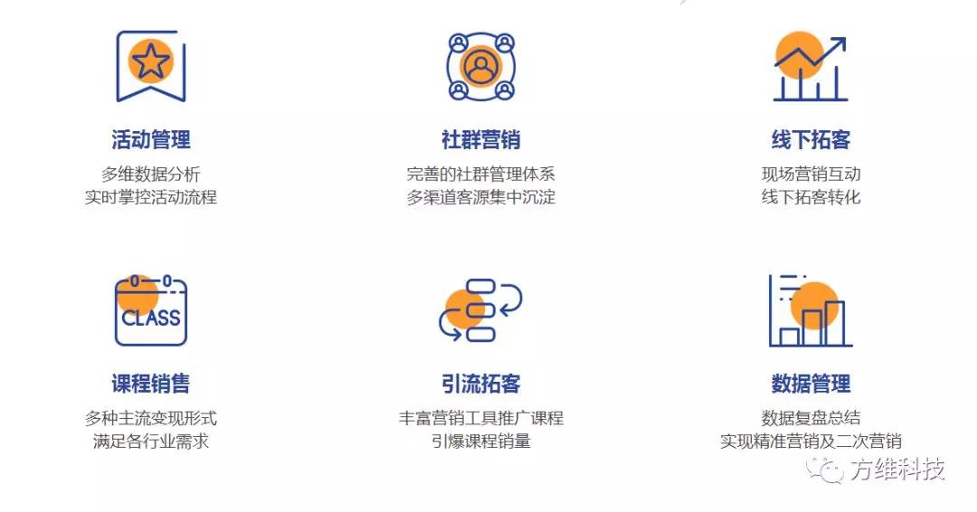 通過(guò)方維教育O2O系統(tǒng),將線上培訓(xùn)課程與線上豐富的營(yíng)銷渠道結(jié)合,并吸引用戶進(jìn)入線上社群,線上、線下場(chǎng)景高度融合更能凸顯教育+互聯(lián)網(wǎng)的優(yōu)勢(shì):