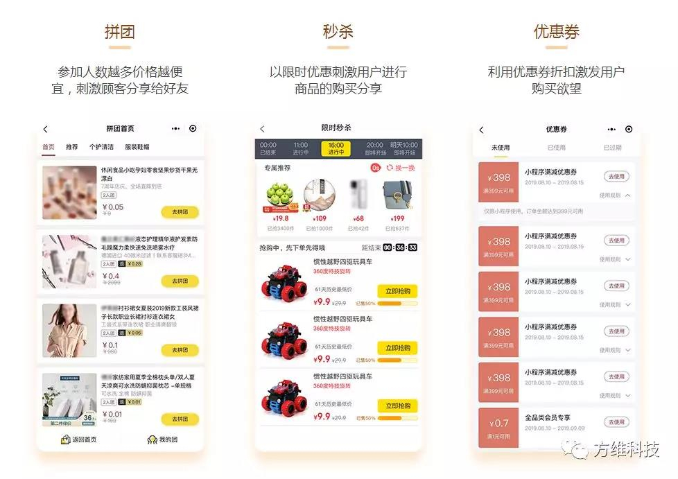 方維會員制社交電商系統(tǒng)擁有豐富的營銷玩法,平臺可通過拼團、秒殺、優(yōu)惠券等多種營銷應用,實現(xiàn)商城高活躍、高客單、高復購的轉變。