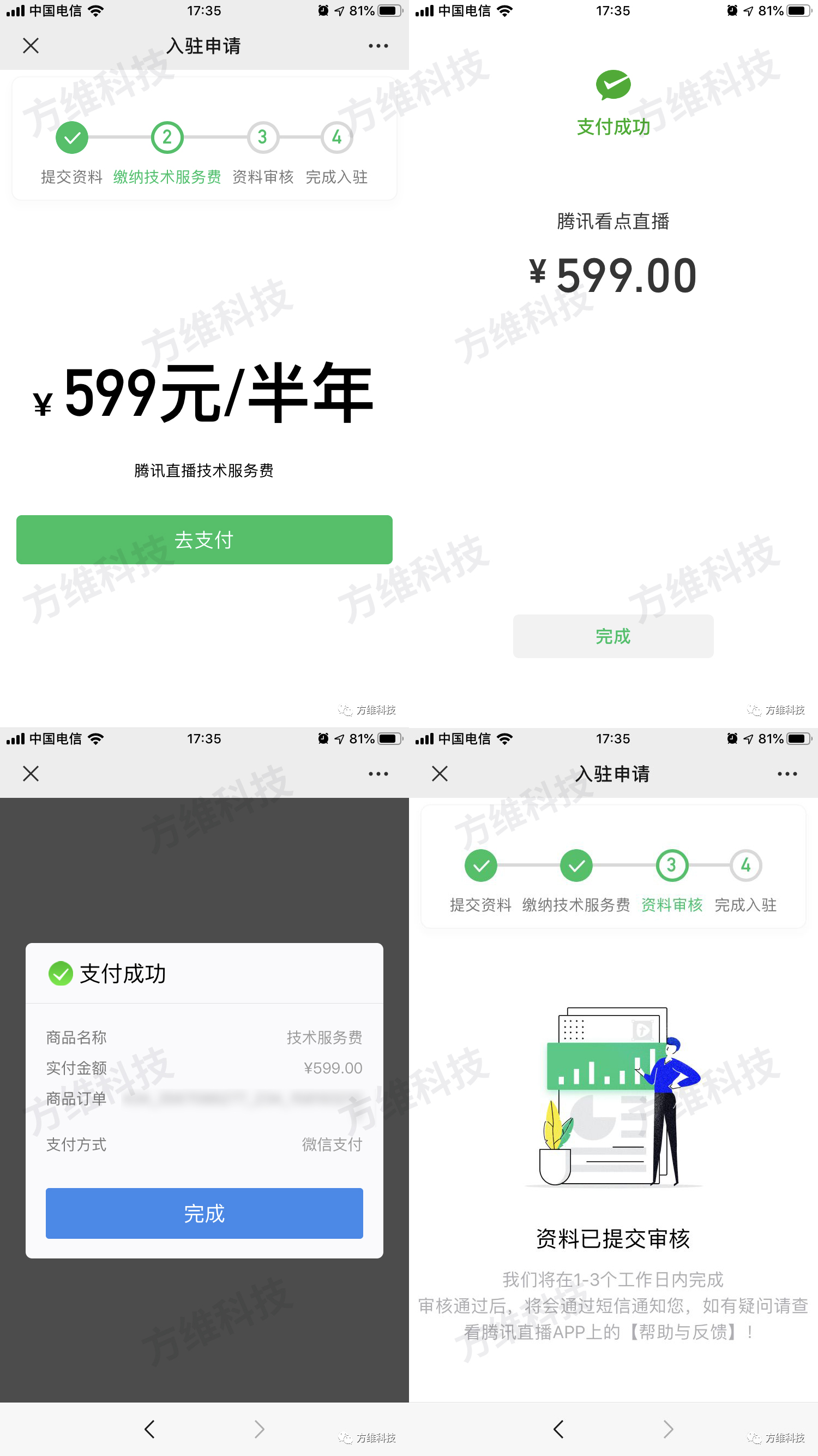 商戶將資料上傳后,支付599元費(fèi)用,等待資料審核即可,該費(fèi)用為騰訊收取的技術(shù)服務(wù)費(fèi)用。