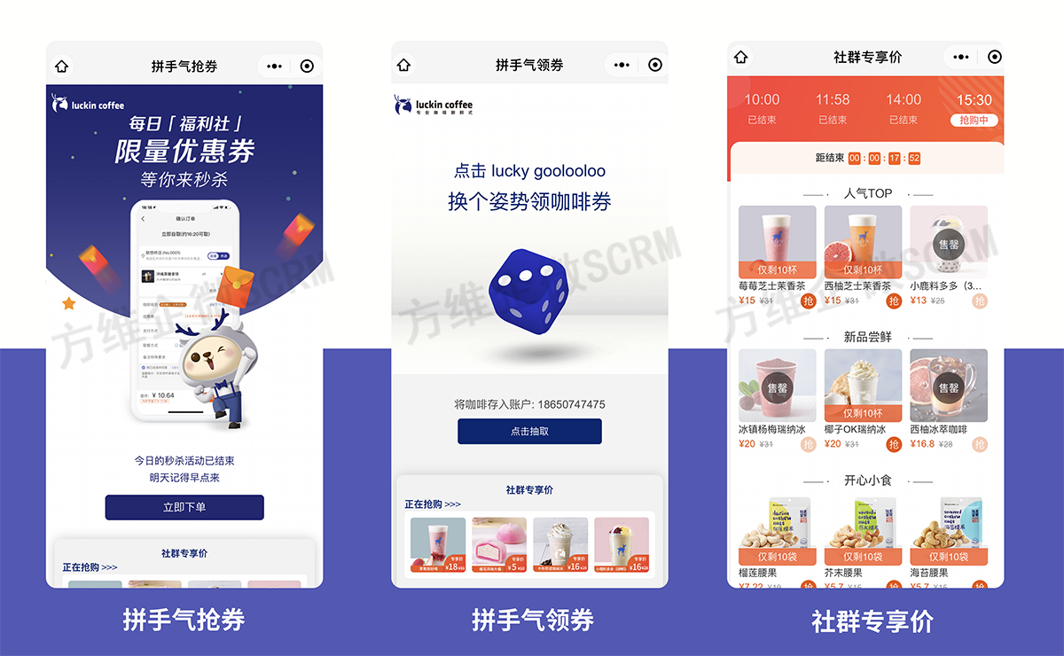 社群運(yùn)營方面,瑞幸選擇把著力點(diǎn)放在了「小程序商城」,結(jié)合優(yōu)惠券玩法,引導(dǎo)粉絲聚焦并進(jìn)行傳播裂變。