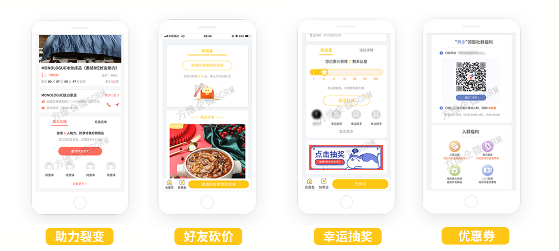「方維SCRM微營銷」通過活動(dòng)+營銷工具,快速裂變用戶并沉淀到私域流量池中。支持助力裂變、好友砍價(jià)、幸運(yùn)抽獎(jiǎng)、優(yōu)惠券等營銷活動(dòng),增強(qiáng)商家裂變轉(zhuǎn)化能力。