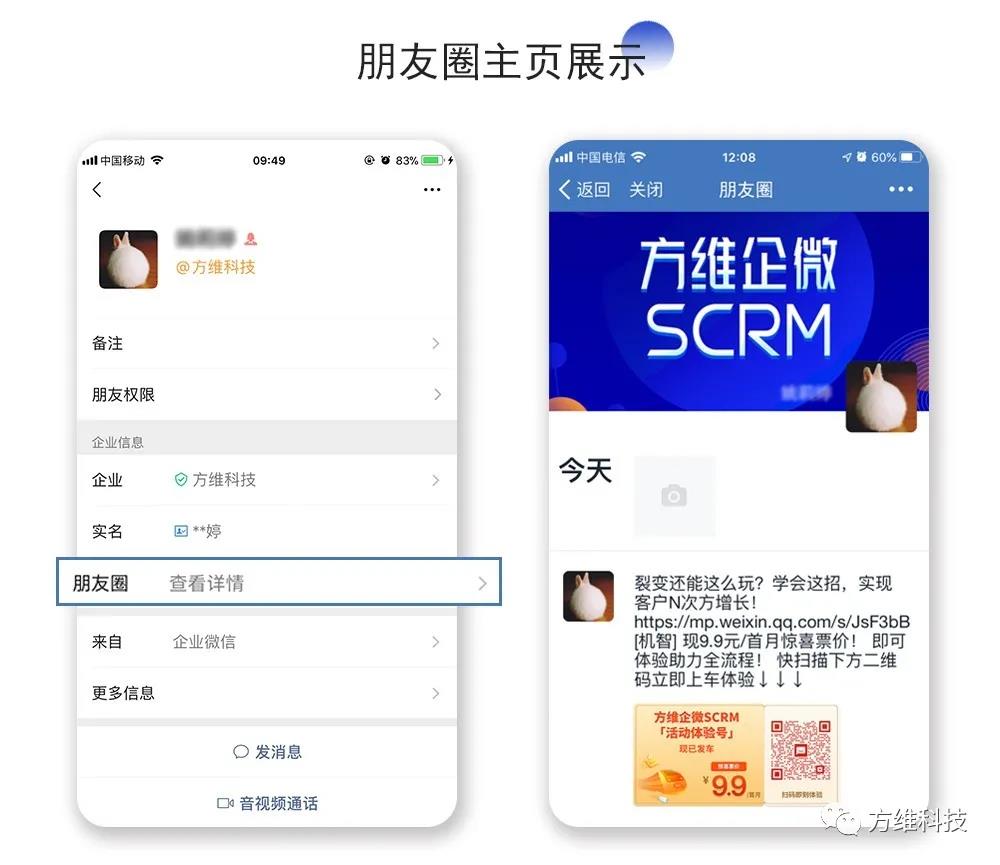 當客戶初次添加企業(yè)員工或在朋友圈看到相關推送內容時,可能進一步查看員工朋友圈主頁,以獲得更加全面的了解。方維企微SCRM突破限制對客戶“開放”朋友圈,使客戶能第一時間了解企業(yè)產品,提高轉化效率。