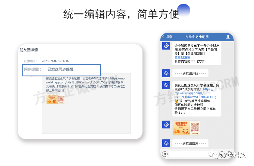 企業(yè)管理員可統(tǒng)一編輯內容,一鍵發(fā)送至方維企微SCRM打造的朋友圈主頁內,作為朋友圈主頁對外展示的素材。