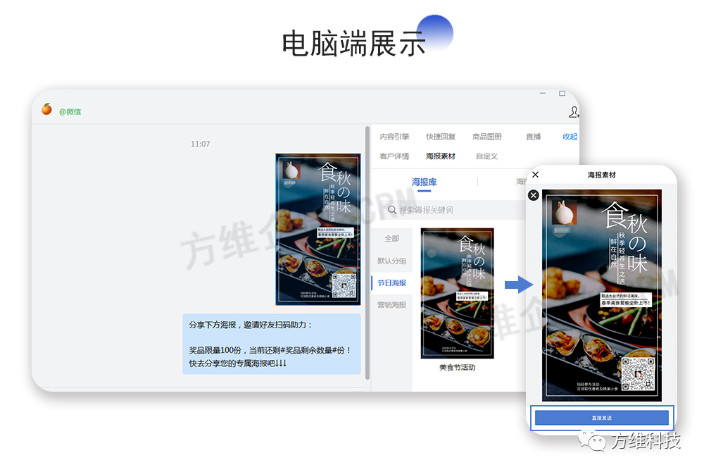 員工在與客戶聊天過程中,打開聊天窗口側邊欄,即可選擇所需海報模板并生成個人專屬海報,一鍵發(fā)送給客戶。