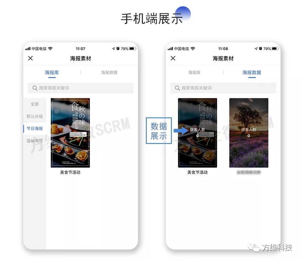 方維企微SCRM升級了企業(yè)微信工具欄,在聊天窗口的側邊欄中,添加「海報庫」功能。一步生成員工專屬海報,并可檢測由海報進入的客戶數據,統(tǒng)計推廣效果。