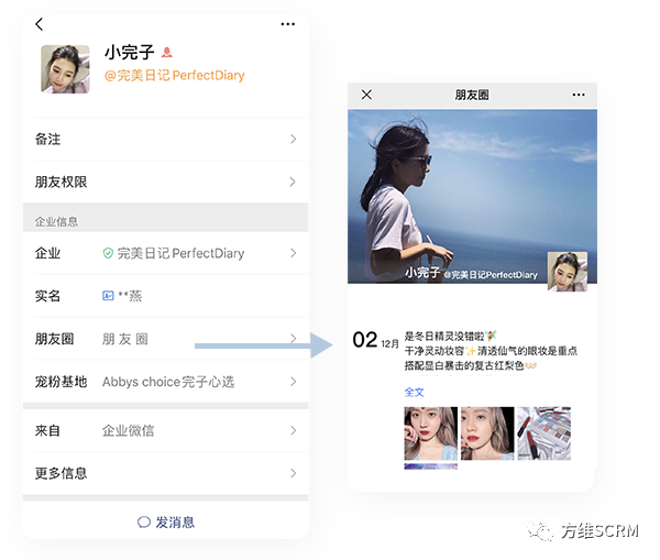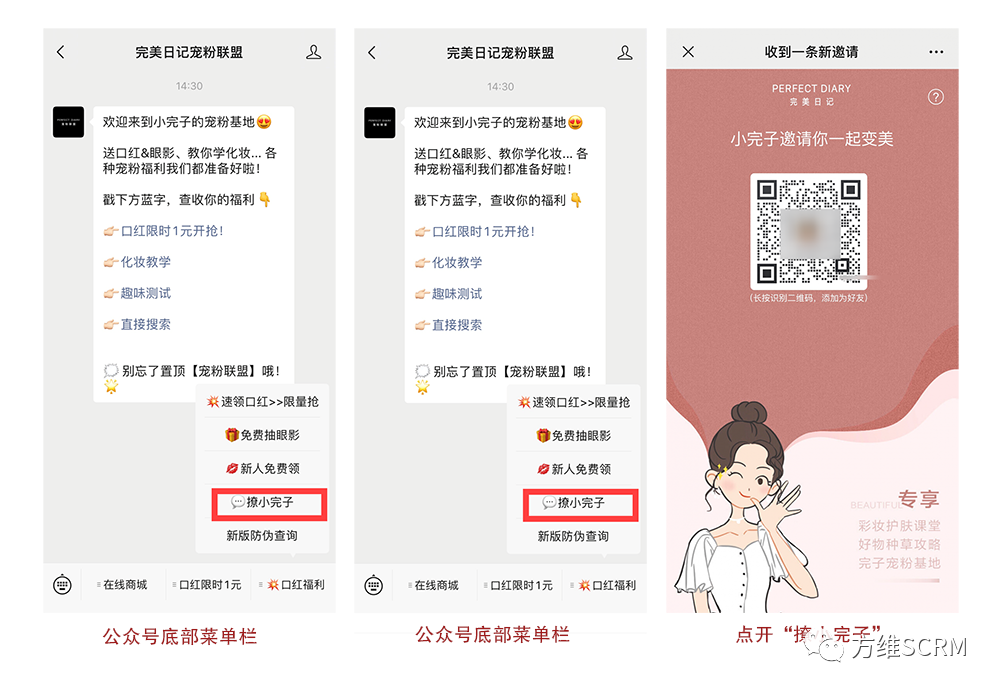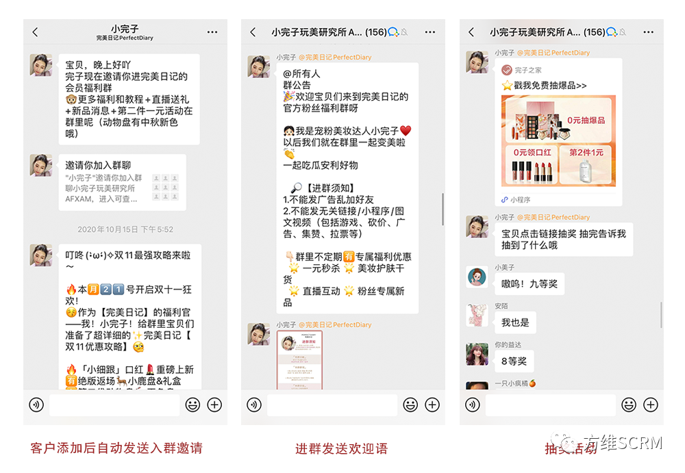 目前,完美日記選擇「企業(yè)微信」作為打造私域的平臺(tái)。完美日記建立企微私域流量是目的是復(fù)購,通過社群運(yùn)營(yíng),將老顧客留下反復(fù)觸達(dá)轉(zhuǎn)化,平衡日益高漲的獲客成本。