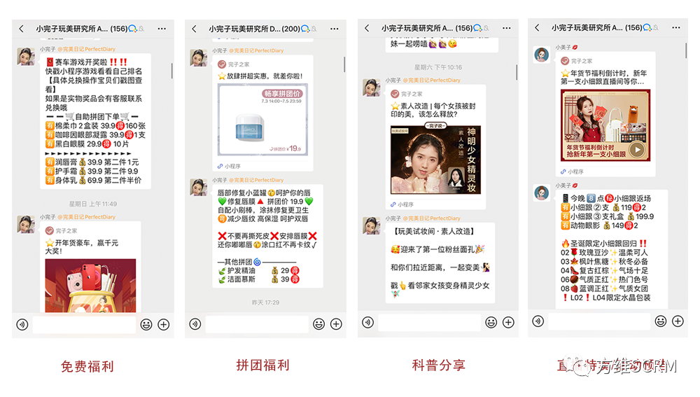 完美日記在公域平臺(tái),針對(duì)用戶群體進(jìn)行“撒網(wǎng)式”營(yíng)銷,在抖音、小紅書、微博和B站等,全方位曝光種草。同時(shí),完美日記品牌在私域流量的表現(xiàn)更是被稱贊營(yíng)銷鬼才。