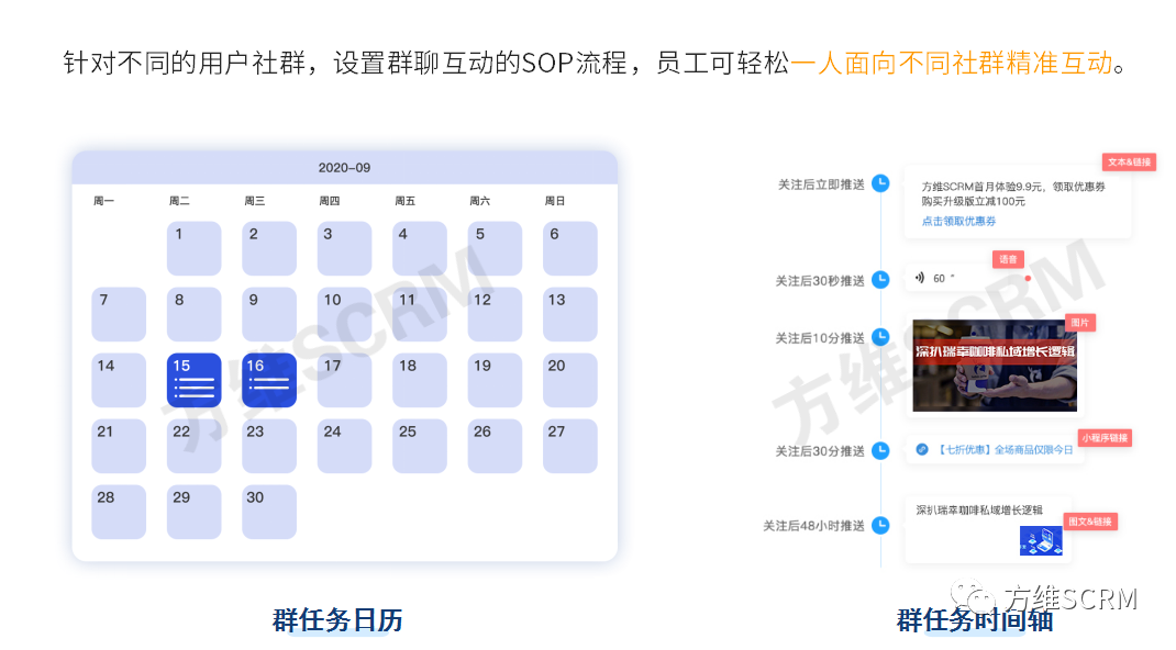 使用「智能互動(dòng)SOP+群日歷」,可以規(guī)劃設(shè)置群內(nèi)一段時(shí)間的互動(dòng)安排,任務(wù)會(huì)定時(shí)提醒,提升效率和轉(zhuǎn)化效果。