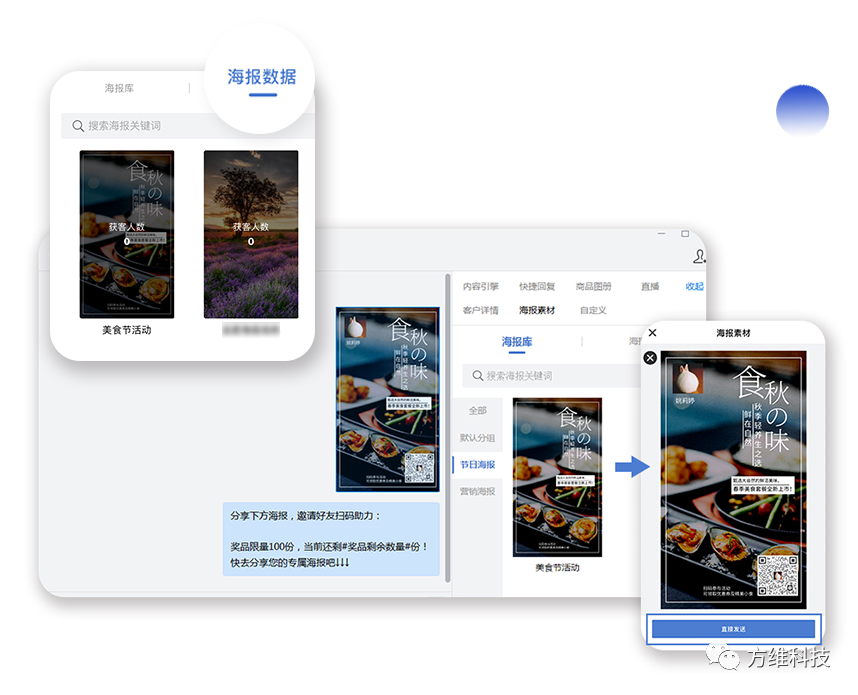 為活動(dòng)效果提供數(shù)據(jù)依據(jù)。「海報(bào)庫(kù)」可一步生成員工專屬海報(bào),并可檢測(cè)由海報(bào)進(jìn)入的客戶數(shù)據(jù),將活動(dòng)效果具象化。同時(shí)為掃碼參加活動(dòng)的客戶打上標(biāo)簽,根據(jù)管理員對(duì)不同海報(bào)的設(shè)置,客戶將被打上對(duì)應(yīng)標(biāo)簽,便于后期精細(xì)化營(yíng)銷及管理。