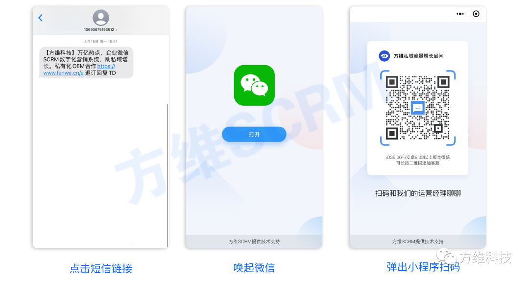 現(xiàn)在使用「鏈接獲客」功能,快速生成小程序跳轉(zhuǎn)鏈接,并通過(guò)方維SCRM的短信營(yíng)銷功能,將鏈接一鍵群發(fā)給用戶。用戶點(diǎn)擊短信鏈接,即可跳轉(zhuǎn)微信小程序,掃碼添加企業(yè)微信,引流更加簡(jiǎn)單有效。