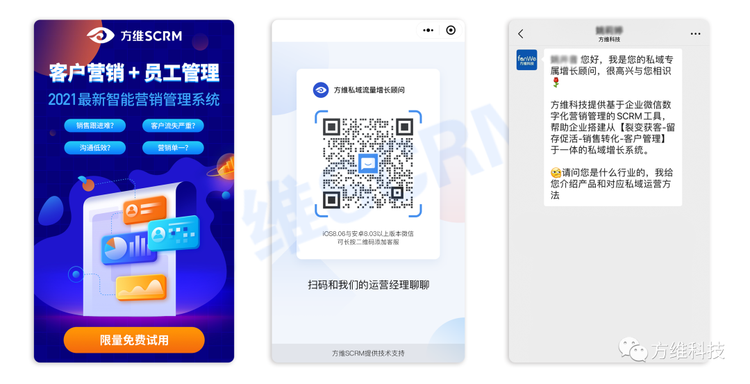 此次功能升級(jí),是廣大搭建私域的企業(yè)一大福音。方維SCRM,幫助企業(yè)縮短引流鏈路與用戶的決策鏈路,提高企業(yè)微信的被加率,一站解決企業(yè)私域引流轉(zhuǎn)化問(wèn)題,節(jié)省人力投入,提高ROI。