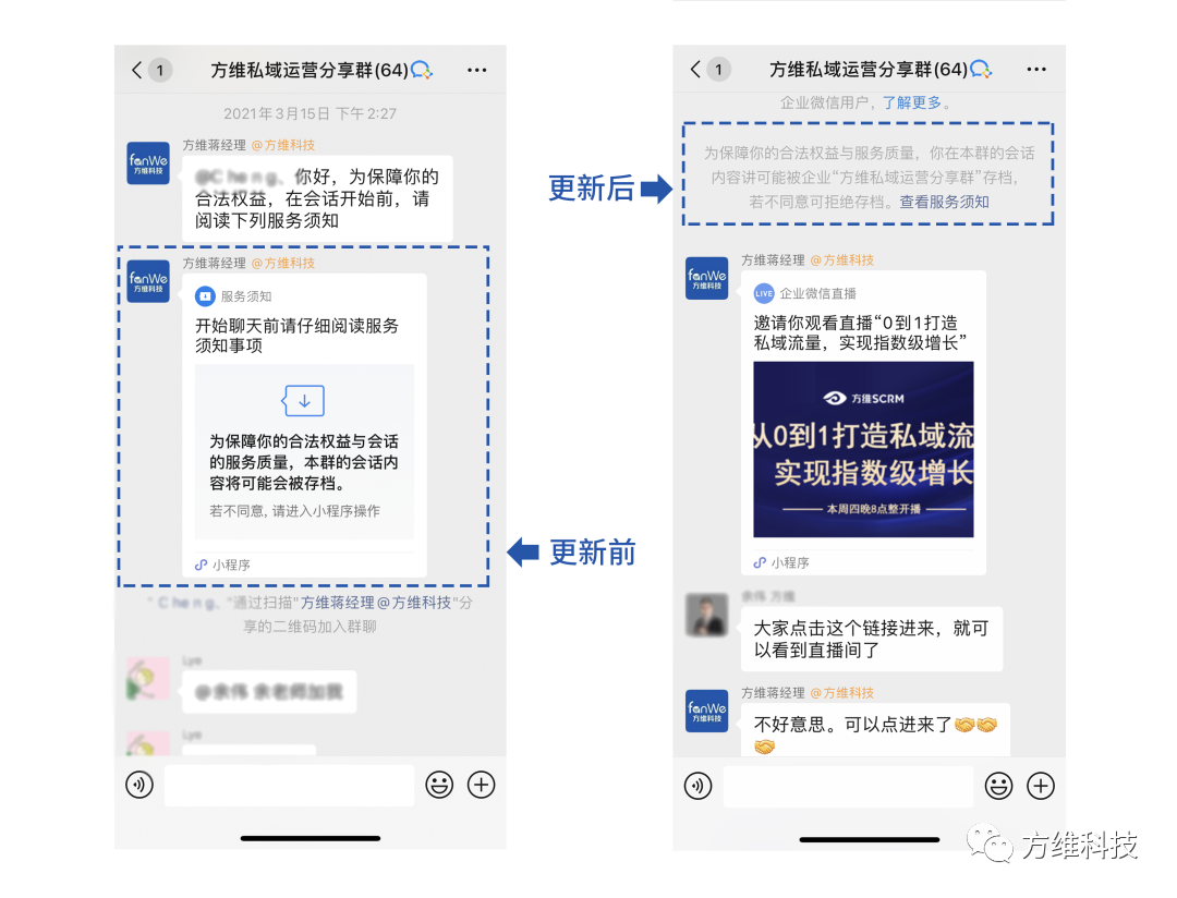 群聊會(huì)話存檔提醒方式,由所有群成員可見(jiàn),變?yōu)閮H新進(jìn)群的客戶個(gè)人可見(jiàn),減少了群內(nèi)老用戶的騷擾