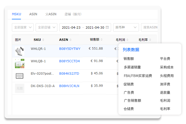 按時間,按MSKU、按父ASIN、按店鋪,多維度的全方位剖析