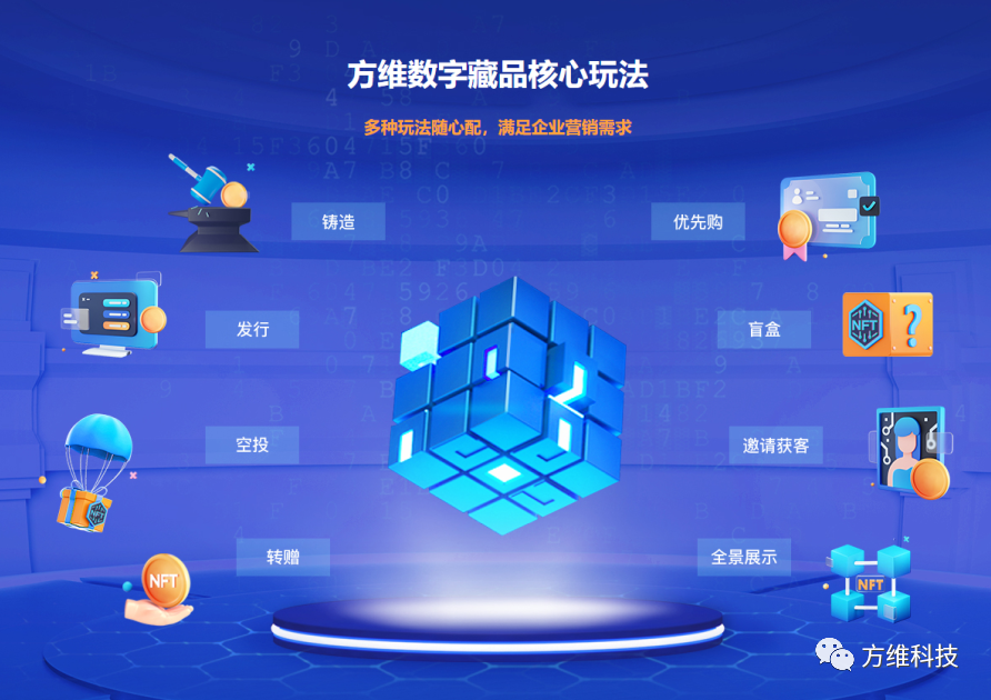 數(shù)字藏品賦予了品牌更多營銷的可能,玩法方面,方維支持數(shù)字藏品發(fā)行方式花樣繁多,空投、盲盒、拉新賦能等互聯(lián)網(wǎng)產(chǎn)品營銷方法全面開花。結合數(shù)字藏品的社交屬性,給予用戶新奇有趣的消費體驗,為企業(yè)注入營銷推廣的新動力。