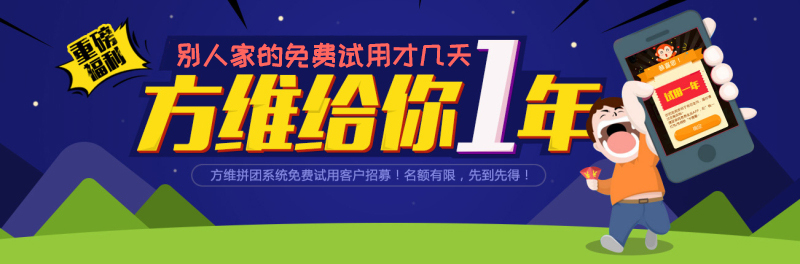 活動(dòng)內(nèi)容:方維招募10名幸運(yùn)客戶,免費(fèi)獲得方維拼團(tuán)系統(tǒng)1年使用權(quán)限,名額有限,先到先得!