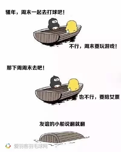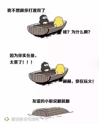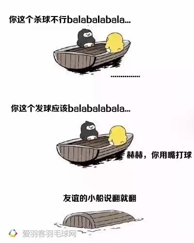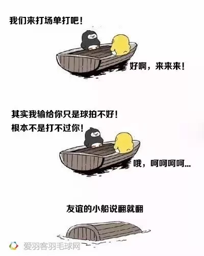 近日,一個(gè)友誼小船的段子可謂是刷爆了小編的朋友圈,于是小編就想到了羽毛球場(chǎng)上那些自己與球友之間友誼小船翻掉的梗。所以,友誼的小船球友版,重磅來(lái)襲!趕緊收藏起來(lái)去調(diào)戲球友吧。