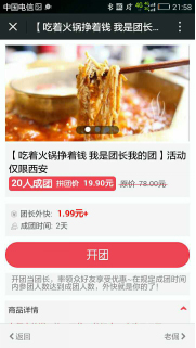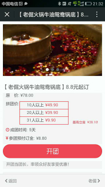 傭金團,顧名思義,團長在拉人參團的過程中會收到傭金。老倔對此傭金團的設(shè)定是,成團人數(shù)20人,傭金團1.99元,也就是說,每個團長必須拉來至少20個人方可成團(從開團時間計起,若參團人數(shù)不到20人,則成團時間到后,系統(tǒng)會通過微信支付自己退款),團員人數(shù)設(shè)置的無上限,團長每拉一個人入團,可得到1.99元傭金,團長自然也有動力去拉更多的人入團。此次傭金團的結(jié)果是,有22位朋友成功開團,他們有的是火鍋店的老顧客,有的是老板的朋友,有的是店內(nèi)的服務員,老倔成功賣出幾百份火鍋底料。
