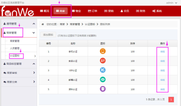 商家的認證圖標在“商家-商家管理-認證圖標-編輯”這一系列步驟中可進行圖標編輯和上傳。