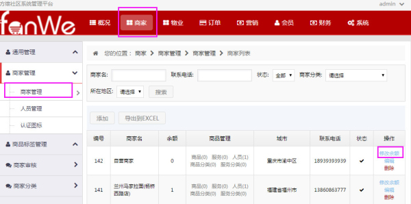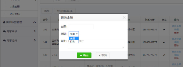 進入平臺管理后臺,依次點擊“商家-商家管理-修改余額”即可對商家余額或會員余額進行編輯修改,有充值和扣款兩種狀態(tài)。在商家管理中還可進行增加系統(tǒng)日志包括修改余額日志、商家和會員變更記錄等。這有利于對商家或會員進行違規(guī)、錯誤操作時,平臺能夠及時進行調(diào)整。