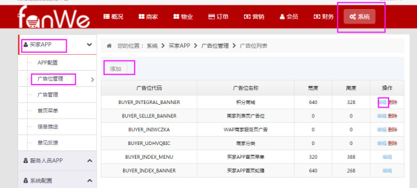 運營方進入后臺,依次點擊“系統(tǒng)-買家APP-廣告位管理-新增/編輯”即可對商家廣告位進行編輯和設置。
