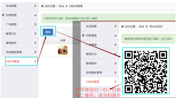 1、點擊掃描員管理頁面中的“添加”,打開微信掃一掃,掃描頁面中的二維碼,成為掃碼員。掃碼員可使用微信掃一掃,掃描到店消費者訂單頁面中的二維碼,為消費者核單。